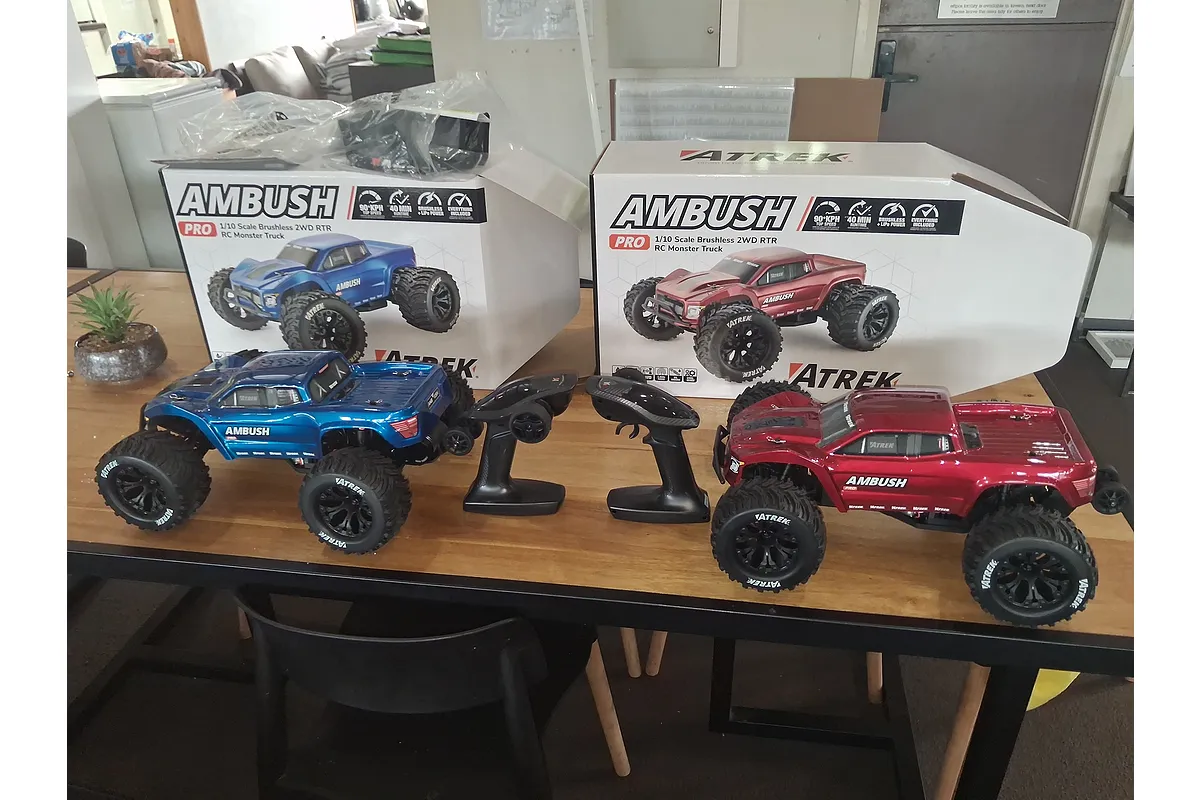 Grab a mate and get racing immediately with this complete two-truck bundle! You get two Atrek Ambush Pro Brushless Monster Trucks—one in Sonic Blue and one in Lava Red—so you can settle the score right out of the box. The pack includes everything for two drivers: two high-capacity 4000mAh LiPo batteries, two rapid chargers and two transmitters with AA batteries! With training modes to level the playing field, it's the ultimate setup for safe, fair, and fast racing fun!