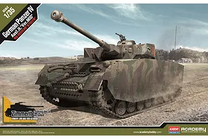The German medium tank Panzerkampfwagen IV was developed in the late 1930s and was used extensively during WWII. The production of the Panzer IV Ausf. H started in June 1943. This version was designated the Sd. Kfz. 161/2. Compared to the previous variants, this model had Zimmerit paste on all the vertical surfaces of its armour in order to prevent adhesion of magnetic anti-tank mines. The turret roof was reinforced from 10mm to 16 and 25mm segments. 5mm hull skirts and 8mm turret skirts were added for further protection, which resulted in the elimination of the vision ports on the hull side. Later the hull was also fitted with triangular supports for the easily damaged side skirts. Along with some other modifications, these additions to the design increased the tank's weight to 25 tonnes, and the maximum speed dropped to 16 km/h on cross country terrain.