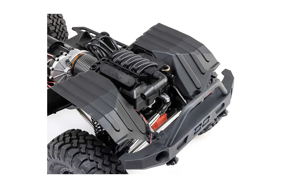 The SCX6 features a scale look V8 engine cover, adding a touch of scale detail as well as extra functionality by acting as a motor mount and protecting the receiver from debris.
