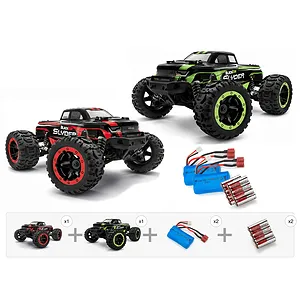 Kick off your RC monster truck adventures with the BlackZon Slyder MT! This 1/16 scale truck is packed with features that make it engaging, durable, and easy to handle, ensuring an enjoyable experience for anyone new to the hobby, while still offering excitement for experienced drivers. Its tough 4WD shaft-driven drivetrain lets you handle the rough stuff, powering through grass and dirt with ease. Independent double-wishbone suspension paired with adjustable coil-over shocks helps the truck glide over bumps and jumps, keeping you in control.