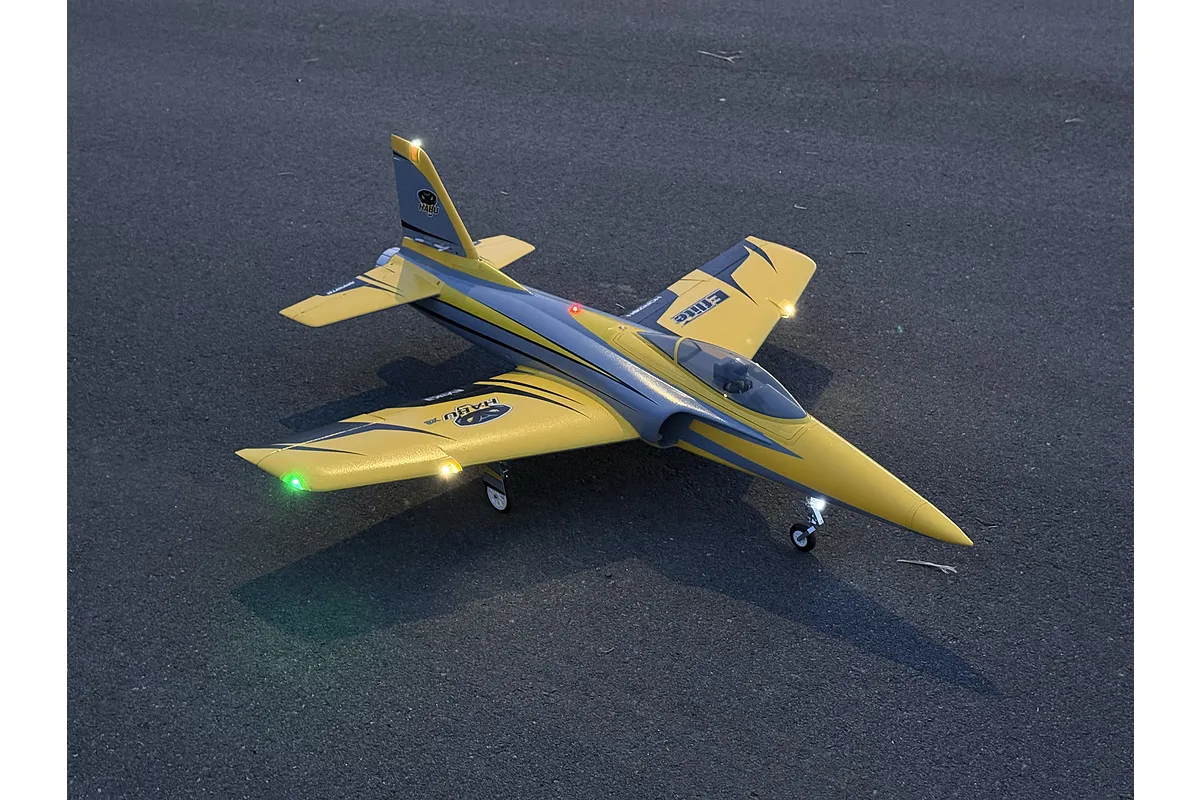 The Habu XS 80mm comes equipped with factory-installed flaps that significantly improve slow-flight capability and overall performance. This allows for shorter takeoffs and landings at slower speeds, making it an ideal step up to a "full-house" jet model from simpler EDFs. For added visibility and orientation, the aircraft also features integrated LED navigation and landing lights.