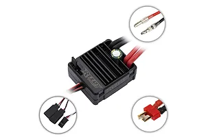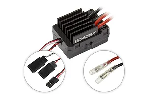 The water-resistant SC480X brushed ESC is specifically programmed for crawling, offering proportional forward/reverse, dual auxiliary power output leads, LiPo low-voltage cut-off protection, and a convenient T-plug connector.