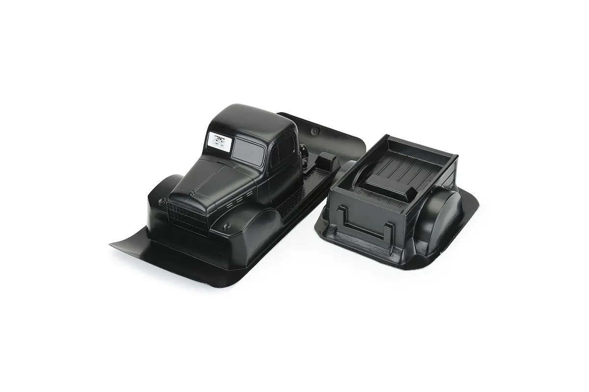 This is a 1946 Dodge Power Wagon 'Tough-Color' Black Body for Crawlers. Pro-Line is proud to introduce the 1946 Dodge Power Wagon Black body for Scale Crawlers made from completely black polycarbonate 'Tough-Color' material! This First Gen Power Wagon body style comes as 2 pieces (Cab and Bed) for an ultra-realistic look that stays true to the original military-inspired 4x4 truck that civilians could buy. The 'Tough-Color' polycarbonate is made from black material, so you never have to worry about paint peeling or chipping off. Realistic window stickers are also included! The 1946 Power Wagon features a huge, menacing flat front grill with large flat panel style fender flares just like the real truck. The body includes textured rocker panels, realistic undercuts and separate round headlights designed to allow for real working LED lights, all of which complete the look of this iconic truck.