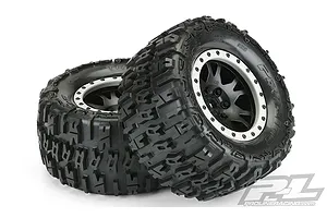 This is a pair of Badlands MX43 Pro-Loc tires. Pro-Line is ready to unleash the long-awaited tire solution for X-MAXX® owners with the Biggest and Baddest tire ever conceived: the Badlands MX43! Pro-Line Badlands tires are known for having a sweet Motocross inspired tread and the all-new Badlands MX43 tires kick that up a notch with a Bigger and Bolder knobby tread that matches modern MX tire design. These tires have been developed from the ground up for extreme X-MAXX® punishment with an all-new ultra-durable compound that prevents tire ballooning even at high speeds. The Badlands MX43 features Pro-Line's groundbreaking proprietary Pro-Loc Technology that creates an ultra-secure bond to Pro-Line's Impulse Pro-Loc X-MAXX® wheels while still being removable when required. The reinforced Tire bead fits into a uniquely shaped channel on the wheel and the bead-loc screws actually pass through the tire rubber before being pinched by the outer bead-loc ring to create the maximum possible mounting security. The Badlands MX43 is a true All-Terrain tire that will find traction on any surface but is best suited for loose & loamy dirt, mud or grass. Just imagine your X-MAXX® throwing up huge rooster tails with these aggressive looking tires!