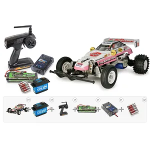 The distinctive ABS (Acrylonitrile Butadiene Styrene) resin space frame remains the core of this buggy, providing a lightweight yet tough structure. While the basic design is unchanged, Tamiya has cleverly updated key components. The rear trailing arm suspension now uses modern diaphragm-type oil dampers, and the driveshafts feature reliable dogbone-style joints for smooth power delivery. The tough nylon suspension components and low centre of gravity battery placement ensure this buggy can handle rough terrain and jumps just like you remember.