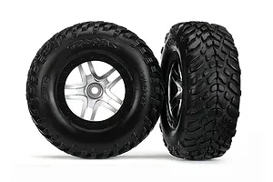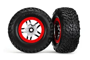 Tires & wheels, assembled, glued (SCT Split-Spoke chrome, red beadlock style wheels, dual profile (2.2" outer, 3.0" inner), SCT off-road racing tires, foam inserts) (2) (4WD f/r, 2WD rear) (TSM rated)