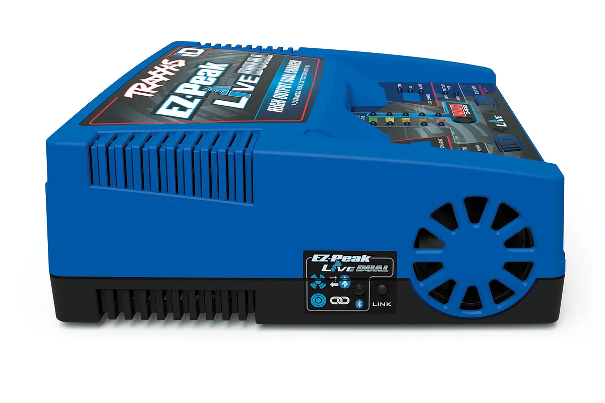 The new EZ-Peak Live Dual iD Charger takes all the advanced features of the EZ-Peak Live and supercharges the power output to over 26 amps (200 watts)! The 4s capable multi-chemistry dual charger uses built-in Bluetooth to work seamlessly with the new Traxxas EZ-Peak Live™ app for iOS and Android. The EZ-Peak Live app gives you detailed information, remote monitoring, and advanced operating functions through the high-definition color interface on your mobile device. It’s the most powerful, most advanced charger in the popular EZ-Peak lineup. Get back in the action sooner with the new EZ-Peak Live Dual Charger!